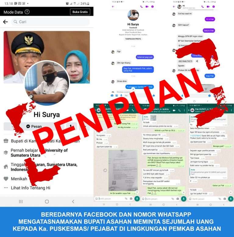 ASAHAN, sln70-news.com – Telah beredar akun palsu Facebook dan WhatsApp menggunakan nama Bupati Asahan dengan foto profil Kepala Dinas Kominfo Kabupaten Asahan. Akun ini tentu saja sengaja dibuat oleh oknum yang tidak bertanggungjawab dengan tujuan tertentu. Sehingga diminta masyarakat untuk melapor jika dihubungi oleh akun tersebut.