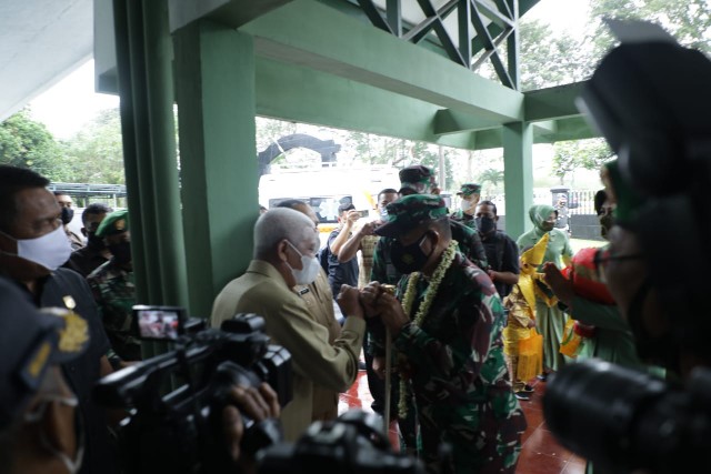 ASAHAN, sln-70-news.com – Bupati Asahan H Surya Bsc menyambut Kunjungan Kerja (Kunker) Pangdam I Bukit Barisan (BB) Mayjen TNI Hassanudin beserta istri dan rombongan di Markas Kodim (Makodim) 0208/Asahan, Senin (11/01/2021)