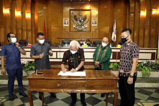 Dikesempatan itu juga Bupati Asahan menyerahkan Buku Rancangan Awal RPJMD Kabupaten Asahan Tahun 2021-2026 Kepada Ketua DPRD Kabupaten Asahan. (Wk)