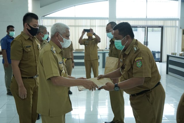 Seusai menyampaikan arahannya Bupati Asahan H. Surya, BSc didampingi Wakil Bupati Asahan, Pj. Sekretaris Daerah Kabupaten Asahan, Asisten Perekonomian dan Pembangunan, Asisten Administrasi Umum, Kepala Bappenda Kabupaten Asahan menyerahkan SPPT dan DHKP PBB-P2 Tahun 2021 secara simbolis kepada Camat Kecamatan Tinggi Raja, Camat Kecamatan Air Joman dan Camat Kecamatan Sei Dadap. (Wiku)