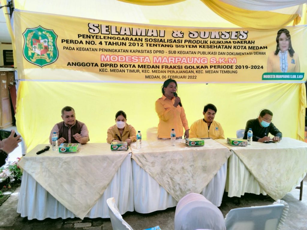 Selanjutnya, Modesta memaparkan isi Perda terkait Kesehatan. Seperti diketahui, Perda No 4 Tahun 2012 seperti dalam BAB II Pasal 2 yakni terciptanya tatanan kesehatan dengan melibatkan semua unsur meningkatkan kesehatan masyarakat. Mewujudkan pembangunan Kota Medan berwawasan kesehatan dan kemandirian daerah dalam bidang kesehatan.