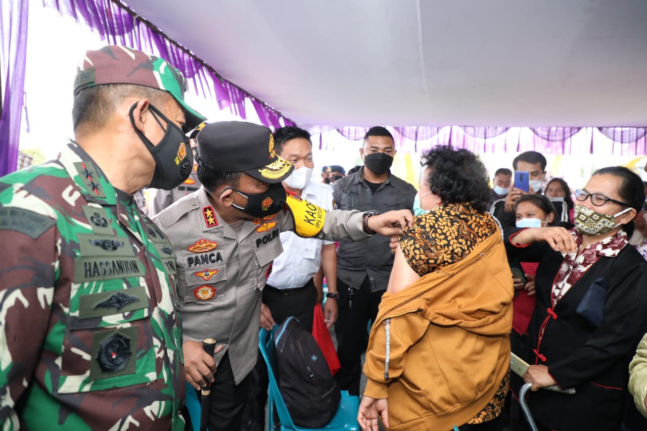 “Tidak sakit divaksinkan bu. Ya, suntikan vaksin ini biar imunitas tubuh kita tetap sehat,” ucap Irjen Pol Panca kepada seorang wanita yang telah menerima suntikan vaksin tersebut.