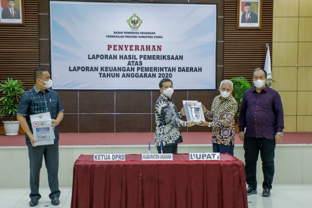 ASAHAN, sln70-news.com – Pemerintah Kabupaten (Pemkab) Asahan kembali menerima opini Wajar Tanpa Pengecualian (WTP) ke 4 kali berturut turut setiap tahunnya dari Badan Pemeriksa Keuangam (BPK) Perwakilan Provinsi Sumatera Utara (Sumut) atas Laporan Keuangan Pemerintah Daerah (LKPD) Tahun Anggaran 2020.