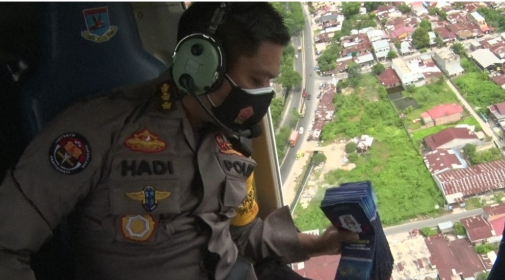 Kali ini dengan menggunakan helikopter, Kabid Humas Polda Sumut, Kombes Pol Hadi Wahyudi, menyebar sejumlah 5.000 brosur imbauan PPKM Darurat dari udara.