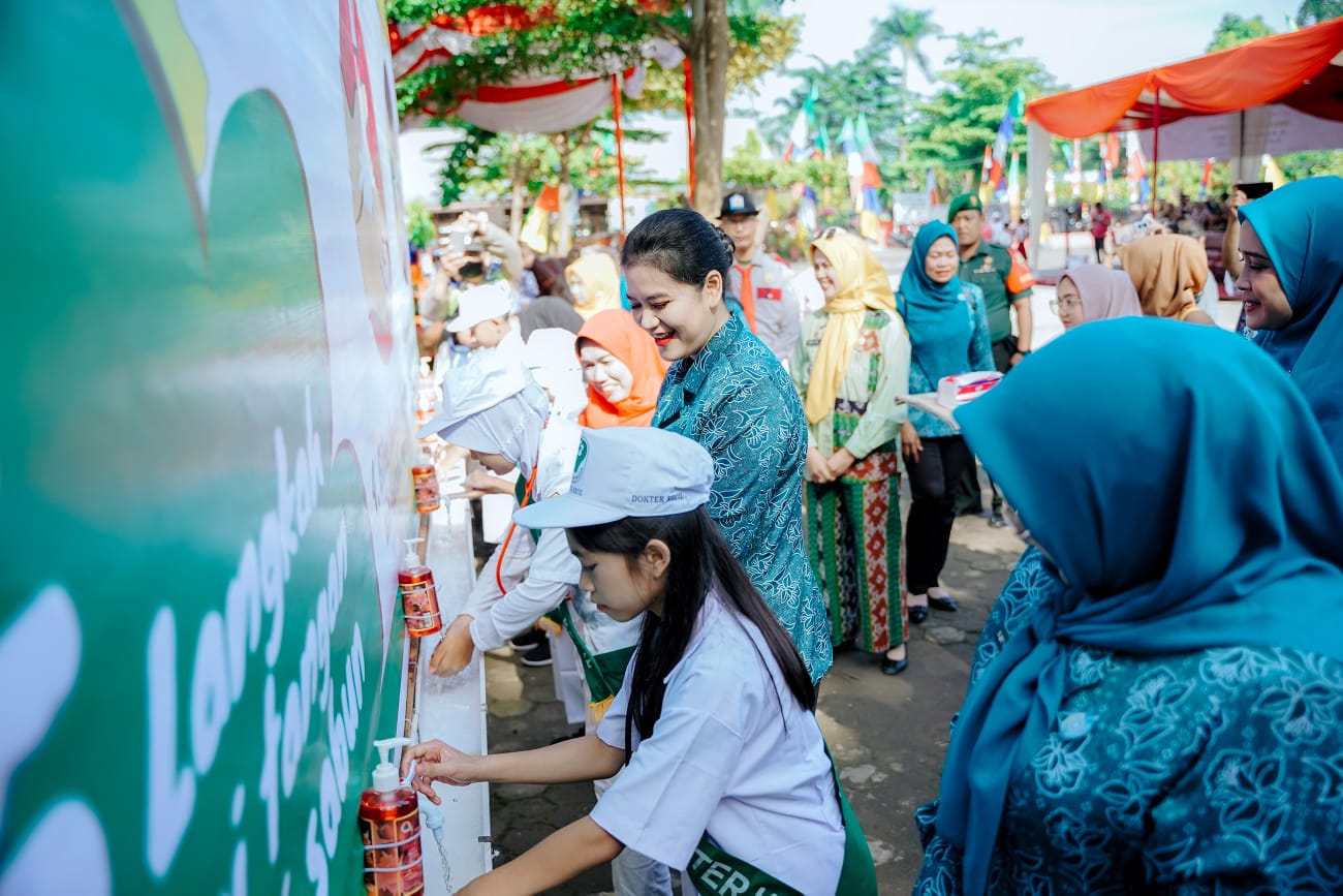 Ketua TP PKK Kota Medan Ny Kahiyang Ayu M Bobby Afif Nasution didampingi Ketua Dharma Wanita Persatuan (DWP) Kota Medan Ny Ismiralda Wiriya Alrahman serta para pimpinan perangkat daerah di lingkungan Pemko Medan, langsung memperagakan bagaimana mencuci tangan yang benar menggunakan sabun dipandu petugas puskesmas dan dokter cilik.